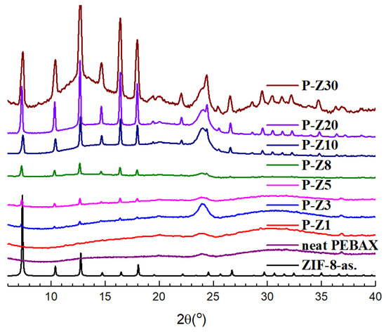 Powder pattern of Pebax/ n wt% ZIF-8 MMMs.