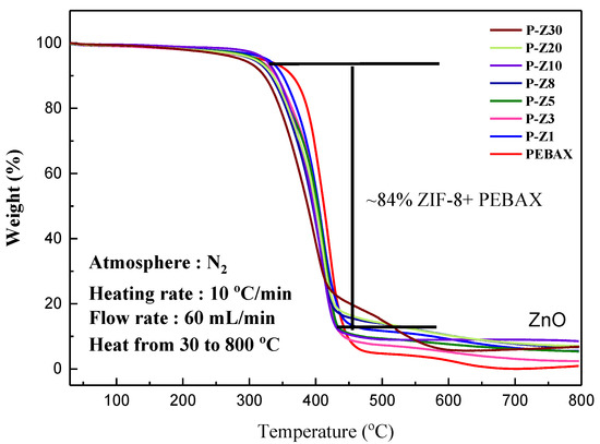 TGA curve of Pebax/n wt% ZIF-8 MMM.