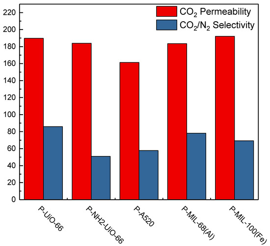 The gas separation test results of the prepared MMM is presented in Figure 7. With reference to their gas separation selectivity, P-UiO-66, exhibited the highest selectivity followed by P-MIL-100(Fe), P-ZIF-8, P-MIL-68(Al), P-UiO-66-NH2, with P-A520 showing the lowest selectivity. Analyzing the reasons for arrangement, MIL-68(Al) and A520 are all 1-D chains, while UiO-66, UiO-66-NH2, MIL-100(Fe), and ZIF-8 are 3-D chains. A 1-D chain structure has only one channel for gas to pass through, and the direction of the channel cannot be controlled, so it is less efficient than the other MOFs. The reason for the poorest separation performance of P-A520 is the use of rapid synthesis. The crystallinity of A520 is not good as observed from PXRD, and the structure is incomplete. It can also be seen from the DFT pore size calculated by N2 77 K adsorption and desorption that there are too many irregular pores, which shows that A520 has many defects and reduces its selectivity. Due to its 1-D channel, MIL-68 (Al) has fewer pores for gas penetration as compared to other 3-D channel MOFs, which in turn affects gas selectivity. UiO-66-NH2 was also synthesized rapidly and it can be seen from PXRD that its structure is not completely constructed and has defects. Because it has the amino (NH2) functional groups while Pebax has hydroxyl (OH) groups, the interaction generates hydrogen bonds, which leads to increased CO2 circulation resistance. UiO-66, which has the best separation ability, has 3-D channels and multiple channels to allow gas to circulate, and UiO-66 has strong water resistance. Even if it is mixed with a solvent, it still retains its good crystallinity. Robeson sorted out a lot of polymer gas membrane separation performance data to make maps, and proposed an Upper bound in 1991 and 2008 respectively, wherein CO2/N2 separation was selected for comparison. The excellent CO2/N2 separation results of P-UiO-66 in comparison to other materials is shown in Figure 8 (Tables S1, S2 and S4).
