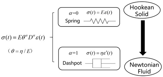 where and represent the stress and the strain, respectively, E is the elastic modulus, is the viscosity and is the relaxation time. It can be seen from Figure 1 that when the fractional order equals 0, Equation (1) represents Hooke’s law of an ideal solid , and Newton’s law of an ideal fluid will be obtained when . That is to say, Equation (1) can describe the viscoelastic behavior of intermediate materials between ideal solids and ideal fluids when the fractional order is a constant between 0 and 1.