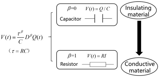 In Equation (2), V is the voltage, Q is the electric charge, C is the electric capacitance, R is the electric resistance, and is the electric relaxation time. Similarly, as shown in Figure 2, when the fractional order equals 0, Equation (2) is equivalent to a capacitor , and when , it can be written as a resistor . Therefore, when the fractional order varies between 0 and 1, Equation (2) can represent the intermediate properties between insulating materials and conductive materials.