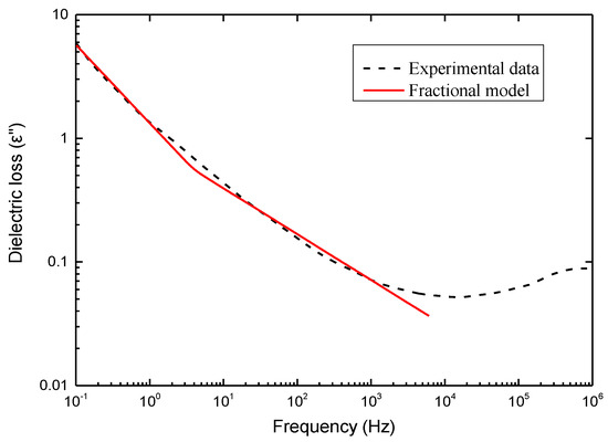 The model fitting result of dielectric loss of PVDF-HFP/NKBT composites is shown in Figure 5. The model parameters and evaluations for different frequency regions are listed in Table 2. Likewise, two different sets of parameters were used in the fractional order dielectric model for the low frequency region of 0.1 to 10 Hz and high frequency region of 10 to 104 Hz. It is demonstrated by Figure 5 that the modeling results satisfy the dielectric loss curve at frequencies smaller than 104 Hz. However, as has been explained in Section 3, when the frequency is higher than 104 Hz the dielectric loss curve of PVDF-HFP/NKBT composites starts to rise due to dipole relaxation. This phenomenon causes the fractional order dielectric model to fail to describe the dielectric loss curve with a range greater than 104 Hz.