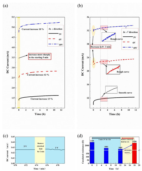 Electrical current changes (resistance relaxation) of printed composites within 12 h under DC voltages. (a) In ⊥ direction. (b) In ∥ direction. (c) Under 3 V for about 673 min, and then the electrical field removed for 2 min, and then the electrical field applied again. Resistance stayed constant with the state before the removal of electrical field. (d) Resistance recovers to its original state after the removal of electrical field for 6 h.