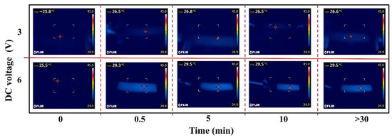 Temperatures changes under the applied voltage of 3 and 6 V, tested in ∥ direction.