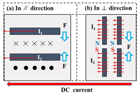 The factor of Joule heating effect increases the resistance and promotes the resistance creep, which is contrary to the behaved resistance relaxation in Figure 1. Therefore, we consider that the factor of the deflection of carbon fibers is dominant in the resistance relaxation. We hereby propose the schematic diagrams of the interaction between carbon fibers under the external electric field, as shown in Figure 3. The printed composites possess abundant conductive pathways, and the magnetic field is induced when the electric field is adopted. The induced magnetic field further functions on the conductive carbon fibers. In ∥ direction (Figure 3a), the two carbon fibers can be viewed as two wires, with the current having the same direction, and the interaction force can be analyzed with Formula (3).