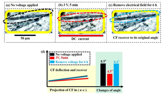 Micromorphology of a fiber: (a) no voltage applied, (b) under 3 V for 5 min and (c) removed electrical field for 6 h. (d) Projection of the carbon fiber in (a–c) and the changes of the corresponding angle.
