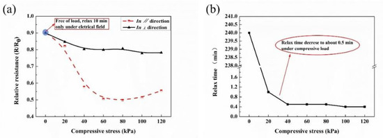The aforementioned experimental results inspired us to verify the role of electrical field on the piezoresistivity; the result is demonstrated in Figure 5, and the test method is depicted in Figure S6. The static resistance of printed composites function with compressive stress is plotted in Figure 5a, where the R0 denoted the initial value when the composites connected into test circuit, and the stable resistance values (R) were recorded. As shown in the blue circle in Figure 5a, in which resistance relaxes only under electrical field (free of load) for 10 min, the corresponding relative resistance decrease to about 0.9. The printed composites exhibited negative compressive resistance effects in both directions, and they were more compressive-sensitive in ∥ direction. The compressive load together with the electrical field are responsible for the downward trend of Figure 5a, and the electrical field plays a more non-ignorable role, especially in ⊥ direction with a higher relative resistance in ⊥ direction. The other need to be highlighted is described in Figure 5b, and the time of the resistance relaxation to a stable value greatly reduced from several hours to about 0.5 min, when the printed composites were compressed.