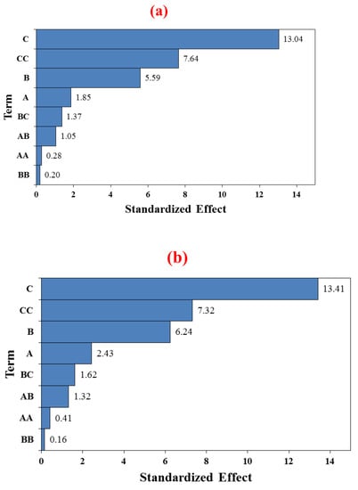 Pareto chart of the standardized effects of three parameters—pH (A), concentration (B), and MCM-41 wt.% (C)—on the permeability of (a) AB-210, and (b) RB dyes.