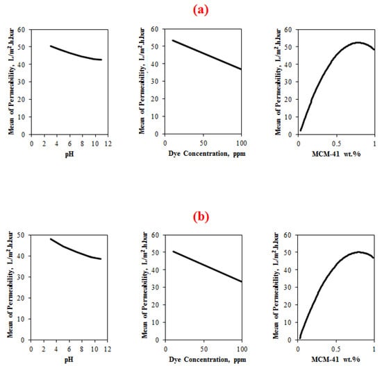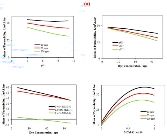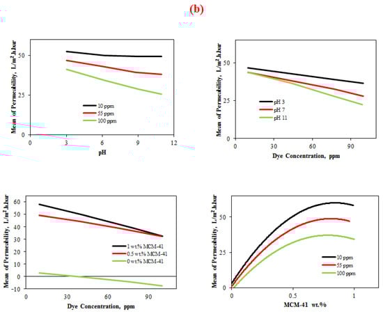 Figure 8a predicts that for the AB-210 dye solution, the optimum operating conditions are a feed pH value of 3, dye concentration of 10 ppm, and 0.828 wt.% MCM-41 content. The maximum permeability is estimated to be 64.25 L.m−2.h−1. It can be concluded that the primary factor in this process is that MCM-41 weight ratios had been added to the casting solution, followed by the secondary factor, dye concentrations. As indicated by the presence of a horizontal line, the feed pH values had no significant influence on the permeability.