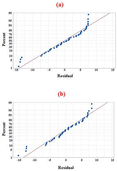 Normal probability plot of the residuals for the permeability of (a) AB—210, and (b) RB dyes.