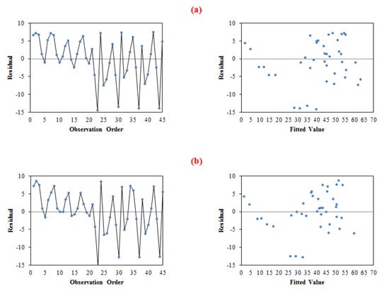 Residuals versus the observation orders and fitted values plot for the permeability of (a) AB-210, and (b) RB dyes.
