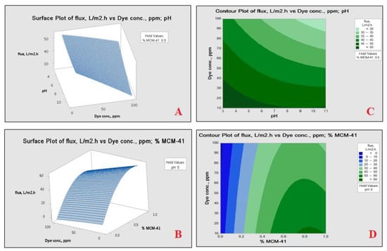 The response surface analysis for RB dye was nearly similar to that of AB-210 dye. Figure 7A,C, presented the effect of the two factors, feed pH and feed concentrations, when the third-factor MCM-41 weight ratio was held at 0.5 wt.%. As it can be seen in the figure, the lower pH shows some minor effects on response with RB dye for lower levels of concentration (See “Interaction plot,” Section 4.3.1.3). Also, in Figure 7B,D, the effect of MCM-41 weight ratio and concentration is depicted at constant pH 5. It is noted that increasing MCM-41 wt.% resulted in the higher permeability. The highest values of permeability were obtained in the 0.8 wt.% MCM-41.