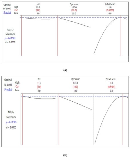 Figure 8 illustrates the optimization design of the membrane permeability with various levels of the three parameters (i.e., MCM-41 wt.% content, dye concentration, and feed pH values). The optimization chart was created using the collected data from the MINITAB®17 computer software. The optimization results are shown in the left column, while the optimum value for each variable is illustrated in the center of the top row (in red).