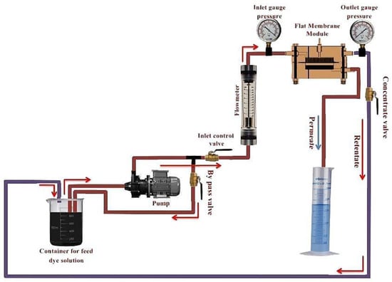 The permeation of the NF membranes was estimated under cross-flow filtration conditions. The apparatus setup was equipped with a membrane cell (7 × 7 × 4 cm3) having an effective membrane area of 16 cm2 (Scheme 1). First, each membrane sample was pressurized for 20 min at 4 bar to compact the membranes before the filtration tests. The pressure was then lowered to the operating pressure of 3 bars at 25 ± 1 °C, and the water permeability magnitudes were recorded. According to what was found in the literature for the concentration of dyes in wastewater [1,2], the separation tests were evaluated under four concentrations (i.e., 10, 50, 80, and 100 ppm) of aqueous solutions for each of the AB-210 and RB dyes. The pure water permeability was determined according to the following equation: