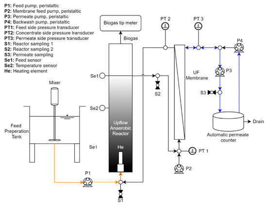The laboratory-scale AnMBR consisted of an upflow anaerobic membrane bioreactor with a liquid volume of 6.2 L and a 1.2 L gas headspace (Figure 1). The custom-built ultrafiltration (UF) membrane module contained 4 tubular (1.1 m long, 5.2 mm ID, inside-out filtration) polyvinylidene fluoride (PVDF) membranes with a nominal pore size of 0.3 µm and a total membrane area of 0.075 m2 (Pentair X-Flow; Enschede, The Netherlands). For heating, a stainless-steel aquarium heater was inserted at the bottom of the reactor where the influent was fed. The temperature of the reactor was continuously monitored using inline sensors. The membrane module was equipped with three pressure transducers placed along the feed, concentrate, and permeate lines for monitoring of the transmembrane pressure (TMP). Sensor data were collected using HOBOware (Onset Computer Corporation; Cape Cod, MA, USA) software. For membrane circulation, permeate production, and backwashing, four peristaltic pumps were used (Cole-Parmer; Vernon Hills, IL, USA).
