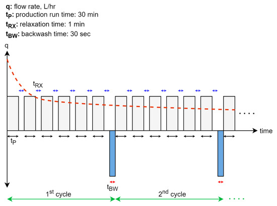 Conceptual cyclic membrane operation compared to continuous operation without relaxation and backwashing cycles (red line). In the continuous operation, a higher initial flux is achieved. However, rapid cake formation on the membrane causes the flux to decline.