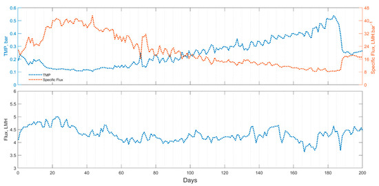 Membrane performance data of the upflow AnMBR: trans membrane pressure (TMP), specific flux; flux.