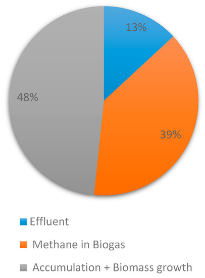 The mass balance for COD was calculated using the daily influent, effluent, and biogas production. The daily influent loading of 501 mgCOD.L−1 corresponded to a 3.89 ± 0.37 g.day−1 loading rate (OLR was 0.61 ± 0.06 kgCOD.L−1.day−1). The daily average effluent COD concentration was 63.9 mg·L−1, which corresponded to 0.51 gCOD.day−1. The difference between the influent and effluent COD mass was 3.38 gCOD.day−1 which was assumed to be due to accumulation/growth and methane production. Since the average daily methane production was 0.525 L.day−1 at STP, the mass of COD routed towards biogas production was calculated using the standard value of 0.350 L.CH4.gCODremoved. Based on this theoretical methane potential, 1.5 g COD was used for methane production, while the remaining 1.88 g COD was either used for cell growth or accumulated in the reactor.