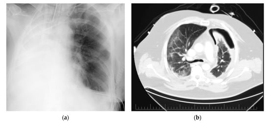 Radiographic images of presented cases: (a) Postoperative chest X-ray of a patient after left-sided double atypical resection and previous right-sided pneumonectomy (ECMO cannulas introduced via right internal jugular and femoral veins); (b) Preoperative CT scan of a patient with bilateral COVID-19 pneumonia with a ground glass and crazy paving pattern and left-sided pneumothorax.