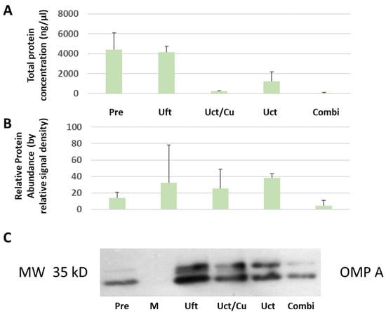Biochemical characterization of OMVs. (A) The total protein concentration of various OMV preparations was measured, after using different methods for concentration (Pre, before concentration; Uft, ultrafiltration; Uct, ultracentrifugation; Cu, sucrose cushion). The strongest signal is found in the sample before concentration (see sample Pre). (B) Densitometry of immunoblots for ompA shows the relative abundances of OMV marker ompA. The strongest signal is found in the ultracentrifuged (see sample Uct). (C) Representative immunoblotting for the E. coli outer membrane protein A (ompA). Using this date, conclusions about the purification capability of the different methods can be made (see Table 2). All error bars indicate standard deviations. N ≥ 2.