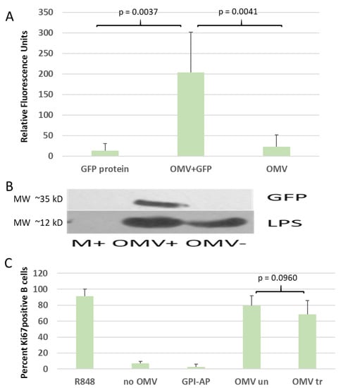 Molecular painting. GPI-anchored GFP only (GFP protein), OMVs only (OMV) and a mix of both (OMV + GFP) were incubated and OMV were separated from not associated material by ultracentrifugation. (A) Fluorometric data after molecular painting. Significantly higher fluorescence was observed in the OMV + GFP samples than in control samples containing GFP protein alone (GFP protein) and OMVs alone (OMV). Residual fluorescence is most likely due to residual GFP protein and vesicle autofluorescence. The p-values derived from t-test are indicated. (B) Immunoblotting for GFP and LPS. While a signal for GFP can only be found in the OMV + GFP samples, LPS is detected in all samples containing OMVs. (C) Flow cytometry analysis. Porcine PBMCs were incubated with OMVs to test the immune stimulatory potential of the vesicles. The B-cell proliferation marker Ki67 was used to show activation. The chemical compound R848 serves as an unspecific stimulator. In the absence of OMVs or in the presence of GPI-anchored proteins only, no significant stimulation is observed (no OMV and GPI-AP samples). OMVs show prominent B-cell stimulation, independent of whether molecular painting has been performed (compare samples OMV un and OMV tr). All error bars indicate standard deviations. N ≥ 2. The p-values are derived from t-test analysis.