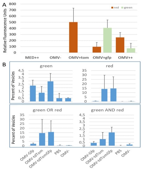 This final set of data most closely reflects the previous immunoblotting data (ref) and the fluorometric analysis of OMV double painting (see Figure 5A). Also, in this circumstance, lower fluorescence is detected for the double-stained samples (see Figure 5A, compare OMV + tdTom; OMV + Gfp and OMV++), supporting the hypothesis that the different labels compete for membrane access.