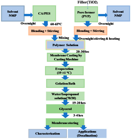 The phase inversion method was used to fabricate mixed-matrix nanocomposite membranes (MMNMs). The total polymer concentration was maintained at 17.5 wt. %, which was achieved by dissolving the PES polymer cellulose acetate and PVP pore former in NMP as a solvent and vigorously stirring for a period of 3–4 h at 65 °C to achieve a nicely dispersed solution. Subsequently, titanium dioxide (TiO2) nanoparticles were mixed with the solvent. The mixture was stirred overnight and then added to the polymer-doped solution. After constant mechanical stirring, the mixed-matrix membranes were casted by a solution casting machine (Automatic Film Applicator, Elcometer4340 M43 6BU (Elcometer Limited, Manchester, UK) at a speed of 50–60 mm/s at room temperature by using water as anon–solvent via the phase inversion method in a coagulation bath for 25–30 s. After the phase inversion process, the resulting fabricated membranes were immersed in a water and isopropanol mixture (70/30) for 19 h then kept in glycerol for 4–5 h to preserve the pores and membrane structure. Finally, the fabricated membranes were dried at room temperature. The membrane thickness was maintained between 0.18–0.22 ± 0.02 mm. Figure 1 shows the steps for nanocomposite membrane synthesis using phase inversion process. During casting, the temperature was maintained at 18 ± 1 °C. Table 1 shows the polymer/pore former concentration and nanoparticles amount in the composite membranes.