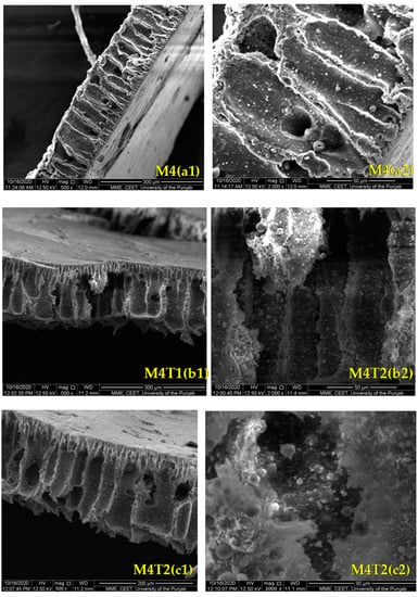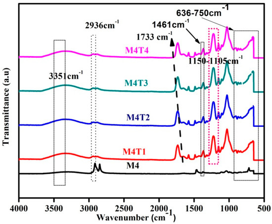 FTIR spectra of the fabricated membranes are shown in Figure 2. M4 is a pristine membrane of CA and PES without any filler. The broad peak at ~1461 cm−1 corresponded to the CH3–C–CH3 group of PES asymmetric stretching [50]. The peak at ~717 cm−1 represents the C=H bending vibrations of PES styrene groups [51]. A wavelength of 919 cm−1 relates to the C–O–H linkage of CA [23]. M4T1–M4T4 is a composite membrane of CA, PES with TiO2, and 7.5 wt. % PVP. Ass light peak shift from 3287 to 3351 cm−1 may be due to the addition of the PVP pore former was observed [52]. A short and weak peak at 1746 cm−1 is attributed to the C–H bending of the aromatic ring of CA [17,53]. In M4T2,the broad PVP peak FTIR spectrum at 3349 cm−1 represents the stretching vibration of the secondary amine N–H group present in PVP [54]. The peaks of 2936 and 2832 cm−1 were known as the stretching of asymmetric C–H alkanes [55] and PVP stretching of O–H, respectively. In the FTIR region of the PVP-based filler membrane, low-intensity bending of CH2 occurred from1151 to 1105 cm−1 [56].The stretching vibrations of symmetric S = O and asymmetric S = O, respectively, can therefore be traced to the bands at 1151 and 1241 cm−1, which are attributed to PES [22]. The small peaks at 636 to 750 cm−1 illustrate the presence of TiO2 in the composite membrane [57]. M4T3 is a composite membrane of CA and PES with 1.5% TiO2, and 7.5 wt. % PVP [52]. The O–H stretching frequency is related to the band at 3304 cm−1 which confirms the CA sample as partially acetylated cellulose [54]. M4T4 is a composite membrane of CA, PES with 2% TiO2, and 7.5 wt. % PVP [17]. This peak increased in its intensity due to the relative increase in the concentration of PVP in the composite membranes. The sharp peak of 1784 cm−1 is the peak of the aromatic ring of PVP. This peak is so strong that it supports the overwhelming effect of PVP on the other organic precursor present in the composite membrane. The presence of the hydroxyl group can be attributed to the peak at 3287 cm−1 and the stretching of the C–O group, ether group, and C–O bond of the CH2–OH group peaks at 1642, 1374 and 1040 cm−1, respectively [58,59]. However, these peaks slightly shifted to 1029, 1733, 1224, and 3349 cm−1 with high intensity in the case of the CA–PES membrane [60]. The peaks at 750 and 636 cm−1 illustrate the presence of TiO2 in the composite membrane [61]. These two peaks are present because of the increased concentration of TiO2 as filler in the composite membrane.