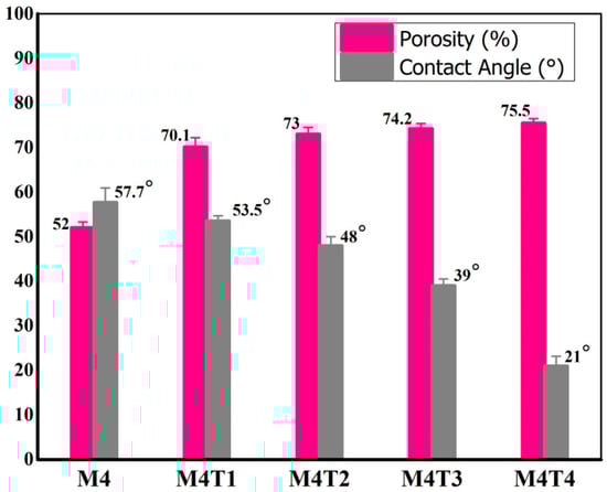 The overall porosity and contact angles of the mixed-matrix nanocomposite membranes are presented in Table 2 and Figure 5 and Figure 6. The porosity measurement results showed that all prepared M4T1–M4T4 composite membranes had high porosity in the 70–76% range compared to 52% for the pure CA/PES (M4) membrane prepared without any filler (Table 2). Figure 5 shows that with an increase in TiO2 concentration, the percentage porosity of the nanocomposite membranes increases. This means that the porosity of the internal structure of the membrane increases similar to TiO2, which also enhances the membrane’s properties and can contribute to improved directional flow rates through the membranes [64].