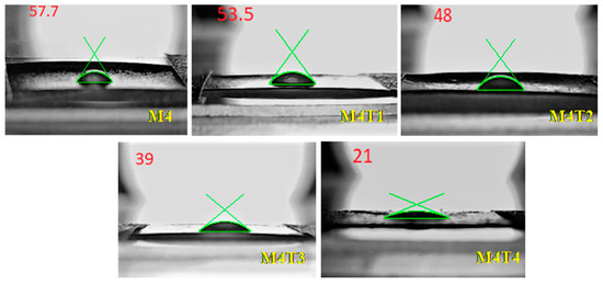 To determine the hydrophilicity, the contact angles of the membranes were measured. This is an indirect evaluation and a major parameter. By using the sessile drop technique, the hydrophilicity of the M4–M4T4 composite membranes was calculated.
