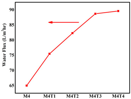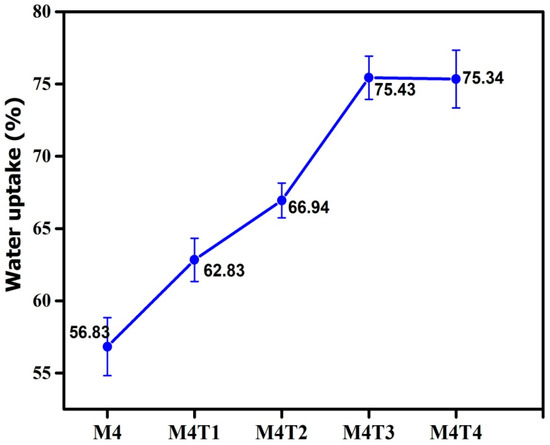 Water uptake was directly related to the hydrophilicity of the membrane [64]. By using Equation (3), water uptake was calculated. The water uptake of the pure membrane was 56.83%, and after adding TiO2 up to 2 wt. %, it was 75.34%, as shown in Figure 7 and Table 2. The water uptake was observed to increase as TiO2 nanoparticles increased, Further, the PVP pore former concentration may have led to increased water uptake. The water uptake of the M4 to M4T4 membranes is shown in Table 2 [70]. TiO2 nanoparticles create spaces in the polymer matrix, which can increase the water uptake.