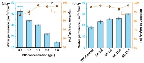 The nanofiltration performance was assessed in a cross-flow flat membrane module at 4 bar. The heat treatment time is optimized to 15 min considering the influence of the hydrogel layer on the drying process after the interfacial polymerization. Figure 6a shows that the water permeance of the resultant TFC membranes decreases from 42.3 Lm−2h−1bar−1 to 15.0 Lm−2h−1bar−1 with the increase of the concentration of PIP when the concentration of SA is fixed at 15.5 g/L, while the rejection of Na2SO4 increases to above 95% with a higher concentration of PIP than 1.5 g/L is used. Therefore, the optimized concentration of PIP is fixed to 1.5 g/L, and the initial concentration of SA for establishing the hydrogel layer is adjusted to control the nanofiltration properties of polyamide nanofilms. Figure 6b reveals that the rejection of Na2SO4 maintains around 97%, but the water flux is greatly increased (about 70%) comparing with the TFC−Control group as the concentration of SA in the hydrogel layer increases, that is the reduced overall thickness of polyamide layer facilitates the improved water permeance. performance of nanofiltration membranes is determined by steric and Donnan effects. The separation performance for different types of mono/divalent salts is basically in line with the characteristics of nanofiltration (Figure 6c), which exhibits a rejection order: Na2SO4 (97.2%) > MgSO4 (82.7%) > CaCl2 (15.8%) ≈ NaCl (15.2%). It also has certain advantages in breaking the trade-off effect compared with other high-performance nanofiltration membranes recently reported in the literature [14,19,24,27,28,32,33,34,35,36,37,38,39,40,41,42,43,44,45,46,47,48]. The collected water permeance and water/Na2SO4 permselectivity A/B are shown in Figure 6d and Table 2.