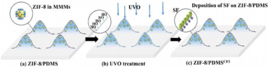 Several methods such as UV/ozone treatment [34], hierarchical micro and nanostructures [35], and modified fillers [36] have been applied to increase the hydrophobicity of the resulting membranes. The membrane obtained by Li et al. [34] was rendered superhydrophobic after UV/ozone (UVO) treatment and deposition of semifluorinated (SF) molecules, as self-assembled monolayers (SAMs) were formed on the hierarchical hybrid surface, as shown in Figure 5. SAMs were fabricated by the combinations of (i) creation of –OH groups and (ii) grafting reaction between SF trichlorosilane and –OH functionalities on the silica surface, which were created by the UVO treatment, in which hydroxyl groups were formed when atomic oxygen and ozone reacted with carbon atoms. These membranes had surface morphology with hierarchical structures similar to that of a lotus leaf, due to the ZIF nanoparticles. This enhanced the surface roughness, which amplified the hydrophobicity of the membranes.