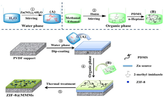 A novel preparation procedure. Preparation procedure of ZIF-8@MMMs membranes. (A) (in water phase) (B) (in organic phase) [42]—(Reprinted from Journal of Membrane Science, vol. 573, H. Mao, H. Zhen, A. Ahmad, A. Zhang and Z. Zhao, “In situ fabrication of MOF nanoparticles in PDMS membrane via interfacial synthesis for enhanced ethanol permselective pervaporation”, pp. 344–358, Copyright (2021), with permission from Elsevier).