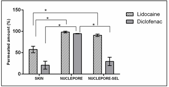 Normalized permeated amounts (%) in the skin, Nuclepore®, Nuclepore®-SEL for lidocaine, and diclofenac sodium. (*) denotes a p-value ≤ 0.05 from the test of Kruskal Wallis.