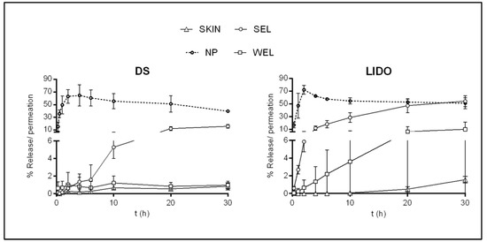 The behavior of active drug kinetics was compared across lanolin membranes, skin membranes, and NP membranes. Maximum liberation was 30 h from the skin as well as from lanolin-based membranes. The penetration through the WEL membranes was lower in both cases than that through the SEL membranes. Similar to the finite dosage penetration assay, the DS permeation profile was more likely to that of the skin for the two membranes. However, the marked diminution of permeation when using the WEL membrane was also observed for the more lipophilic compound. WEL membranes gave results more similar to those of the skin, which could be associated with the different lipid components of the extracted wool wax. The WEL was shown to be the one richest in non-polar lipids [13]. This could promote the creation of a more robust barrier difficult to overcome for hydrophilic and lipophilic compounds such as DS and LIDO.