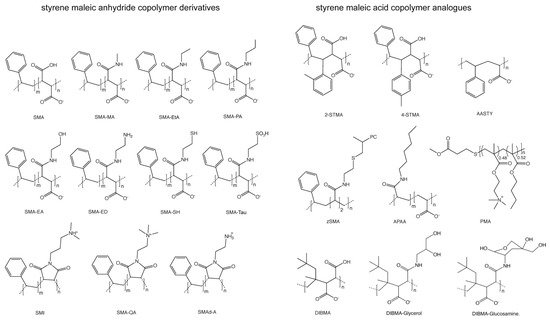 Types of copolymers used to solubilize transmembrane proteins within native nanodiscs. The hydrolyzed derivatives of styrene maleic anhydride include styrene-co-maleic acid (SMA) [4], styrene-alt-maleamic acid (SMA-MA) [5], SMA ethanolamine (SMA-EA) [6], SMA ethylenediamine (SMA-ED) [7], SMA with sulfhydrils (SMA-SH), [8], SMA with taurine (SMA-Tau) [9], styrene-co-maleimide (SMI) [10], styrene maleimide quaternary ammonium (SMA-QA) [11], and dehydrated SMA ethylenediamine copolymer (SMAd-A). The analogues of SMA include poly(2-methylstilbene-alt-maleic anhydride) (2-STMA), poly(4-methylstilbene-alt-maleic anhydride) (4-STMA) [7,12], acrylic acid-co-styrene (AASTY) [13], zwitterionic SMA (zSMA) [14], alkyl polyacrylic acid (APAA) [15], polymethacrylate (PMA) [16], and diisobutylene-alt-maleic acid (DIBMA) [17] as well as its glycerol- and glucosamine-containing derivatives.