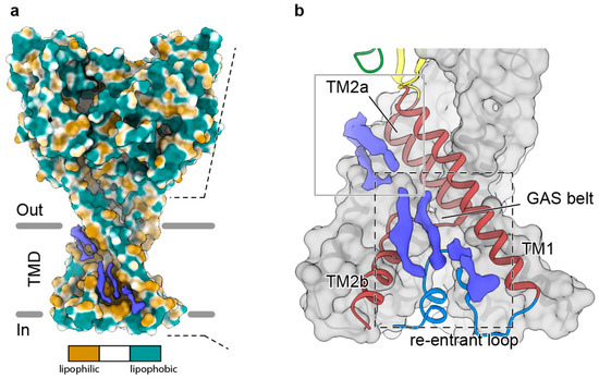 Structure of the ASIC1 ion channel in a SMALP and shown as a surface. (a) The exposed residues are colored based on whether they are lipophilic or lipophobic. (b) In the expansion the positions of lipid molecules are in blue along with the underlying transmembrane helices in red. The position of the “Gly-Ala-Ser” (GAS) belt element that forms a constriction within the channel is indicated. Taken from [57].