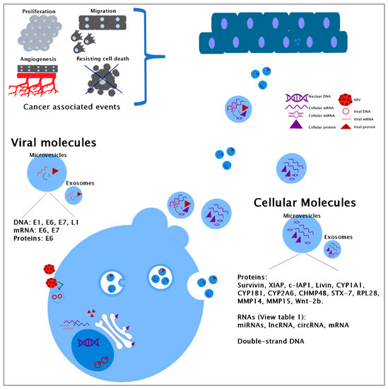 In cervical cancer, the main content of EVs has been analyzed. Like in other illnesses, it has been demonstrated that EVs could contain proteins and nucleic acids. Even not all viral proteins have been localized in EVs; it has been possible to identify the E6 oncoprotein in EVs of CaSki cells, a cell line of cervical cancer. In addition, it has also been determined that EVs can contain genomic and viral DNA. The RNAs in EVs include those from the cellular origin and viral mRNAs coding for E6/E7 oncogenes. Other molecules such as purine metabolites, amino acids, fatty acids, saccharides, and several other metabolites have been identified in exosomes derived from different cancers, mainly through mass spectrometry coupled to a previous separation method. The exosomes analyzed include those derived from head and neck squamous cell cancer (HNSCC), which is also related to HPV infection. But up to date, there are no reports about these molecules in cervical cancer [71,72].