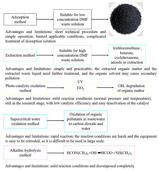 At present, the wastewater containing DMF has been treated by various methods, including biological methods [3], physicochemical methods [4] (adsorption and extraction) and chemical methods (catalytic oxidation [5], supercritical water oxidation [6] and alkaline hydrolysis). The above methods are suitable for treatment of wastewater with different concentrations of DMF. Firstly, one of the biological methods is a conventional aerobic activated sludge process [7,8,9]. Biological process is the most widely used method in wastewater treatment because of its mature process and low operating cost. However, biological treatment of DMF wastewater is always limited by the long treatment time and incomplete degradation. Biological treatment will be negatively impacted by the microbial poisoning caused by DMF. Secondly, physicochemical methods are economical and rapid pretreatment methods for DMF removal and, especially, extraction and adsorption methods are commonly used in industry. Low-DMF wastewater can be adsorbed by activated carbon, while high-DMF solutions can be separated by trichloromethane, benzene, cyclohexanone, anisole and other extractants [4,10]. Thirdly, among all chemical methods suitable for industrial application alkaline hydrolysis is based on the principle that amides can be broken into corresponding amines and salts in a strong base solution [11]. Besides, this method requires mild reaction conditions with DMF completely decomposed, which deserves further research in industrial application (Figure 1).