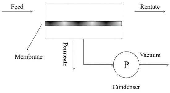 Pervaporation (PV), an emerging technology, is a relevant part of energy conservation and environmental friendliness of membrane separation [14]. It is competitive over conventional separations in separating azeotropic mixtures, thermally sensitive compounds and organic–organic mixtures and in removing dilute organic compounds from wastewater [15,16,17,18]. Comparably, evaporation is the thermally based separation process, through which the solvent is separated from the non-volatile solute by phase transition [19]. At the molecular level, this latent heat reflects the energy required to break hydrogen bonds between water molecules, which is much greater than that required to move solute and water molecules, and to overcome their inherent tendency for a homogeneous state [20]. Since only a fraction of a mixture is vaporized, pervaporation requires lower temperature than conventional distillation, which is more energy-saving. This process can be divided into two parts: the upstream side of the membrane, which contacts with the feed liquid mixture, and the downstream side, which is applied with vacuum or sweep gas to generate a chemical potential difference, namely a diving force for the separation [21] (Figure 2). The separation mechanism of pervaporation predominantly relies on the preferential sorption and diffusion of the target component through the membrane [22,23,24] (Figure 3).