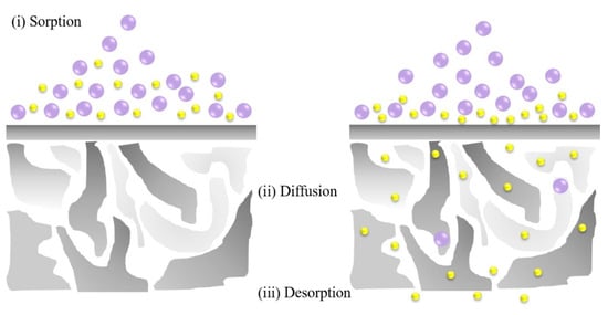 Solution–diffusion is the worldwide accepted mechanism of mass transport through membranes, which was first proposed by Graham [26] based on his research on gas permeation through homogeneous membranes. As can be seen in Figure 3, the permeation is composed of following three fundamental processes: (1) sorption of solute molecules in the surface of the membrane; (2) diffusion of the molecules across the membrane; (3) desorption of the dissolved molecules in the other surface of the membrane. Generally, it is acknowledged that the thermodynamic equilibrium reaches immediately at the interface between feed side and membrane when feed mixture contacts with the membrane [26,27], therefore