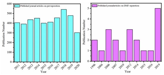 Recent published journal articles on pervaporation and DMF separation. Data were obtained from the Web of Science.