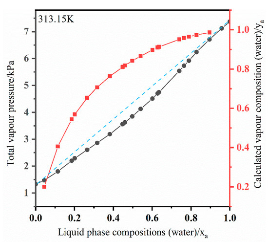 Vapor–liquid equilibria of DMF + water as a function of mole fraction of water.