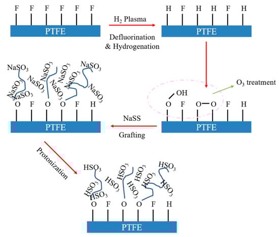Tu et al. [58] prepared poly(tetrafluoroethylene) (PTFE) membranes performed by means of combined hydrogen plasma and ozone treatment and surface-initiating grafting polymerization in which sodium 4-styrenesulfonate (NaSS) was used as monomers. After that the PTFE-g-NaSS membrane was further treated with 1 M HCl(aq) solution at room temperature to convert the sodium sulfonate groups to sulfonic acid groups (PTFE-g-PSSA). With treated by hydrogen plasma, some C-F bonds with high bonding energy difficult to be treated by ozone on PTFE membrane surface were devoted to C-H bonds. Then, the C-H bonds served as reactive cites under ozone treatment to form peroxide groups. After that, NaSS on PTFE membranes surface triggered surface-initiating polymerizations generating hydrophilic chains consequently leading to the incensement of the surface hydrophilicity. Finally, with protonation, the sulfonated groups of PTFE-g-PNaSS were converted to sulfonic acid groups (PTFE-g-PSSA) (Figure 6). The polymerization rendered the membranes high hydrophilicity and higher permeation flux with a water contact angle of 38° and permeation flux of 345 g·m−2·h−1 while those without protonation with an angle of 68° and flux of 308 g·m−2·h−1. It is notable that the swelling degree of the membrane in DMF solutions (90 wt % of DMF content) was 0.34% less than 0.4% indicating its resistance to swelling and application potential for separating DMF. It is also noteworthy that the separation factor of this work was up to infinite, namely, 100 wt % of water in the permeating side, which is deliberate.