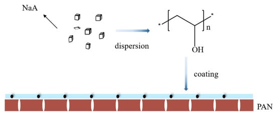Shao and her coworkers [12] prepared NaA zeolite membranes by dispersing NaA zeolites homogenously in PVA solutions. Then, the membrane solution was coated on the polyacrylonitrile (PAN) substrate (Figure 7). They focused on the effect of the times of membrane casting on pervaporation performance and concluded that the optimum times of casting was 3. The mass fraction of NaA in casting solution was 10% and operation temperature was 24 °C, which was at room temperature meaning without extra heating supplement. The results indicated that the permeation increased with the enhanced temperature, which ranges from 18 to 42 °C. The permeation flux of NaA/PAN membrane reached 1.84 kg·m−2·h−1 and the separation factor was 11.5 when the feed mass fraction of DMF was 20%, the feed flow rate was 1.5 m3/h and the pressure at the permeate side was 500 Pa.