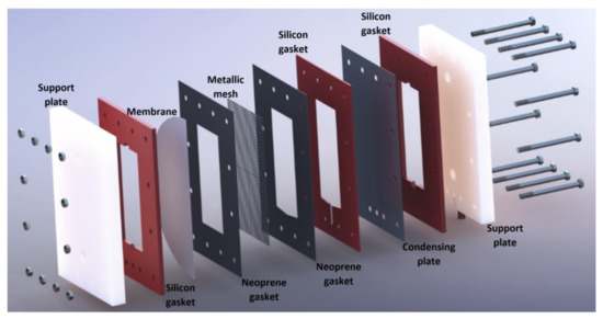 The H2O/LiBr solution channel was 180 mm in length, 80 mm wide, and 3 mm thickness, and it was created by the junction of the support plate, the thermal-resistant silicon gasket, and the hydrophobic membrane. An air gap with 3 mm of thickness was at the other side of the hydrophobic membrane, two neoprene gaskets, the metallic mesh, one silicon gasket, and one side of the condensing plate. Finally, the cooling water flowed in the channel created by the other side of the condensing plate, the thermal-resistant silicon gasket, and the support plate. Figure 2 shows the components of the experimental membrane-based desorber.