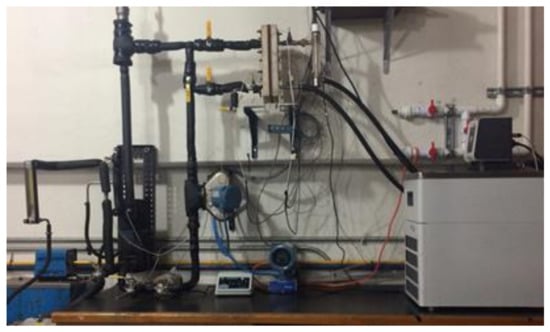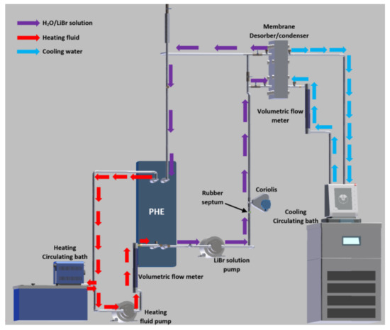 A 316 SS plate heat exchanger (PHE) was used to heat transfer from the heating fluid to the H2O/LiBr solution, and the thermal source was a Cole-Parmer Polystat digital heating circulating bath of 6 L volume and 1000 W electrical power. The cooling water temperature was kept constant with a Julabo CORIO 601F refrigerated/heating circulator bath of 10 L volume and 2000 W. A Coriolis mass flowmeter was used to measure the solution mass flow rate (LiBr). The heating fluid stream (Vhf) and the cooling water stream (Vcw) were measured with analogical flowmeters. A rubber septum was placed in the LiBr solution loop, and a liquid sample of the H2O/LiBr solution was drawn out for each experimental test. An ABBEMAT 200 refractometer was used to determine the salt solution concentration using a refractive index (RI) correlation previously reported for H2O/LiBr mixture [39]. The solution and the heating fluid were pumped by using two gear pumps of 32 W power. An electronic weighing scale was used to measure the amount of distilled water (wdis). The temperatures of the inlet and outlet streams of the membrane-based desorber and the PHE were measured with RTD pt100 temperature sensors. The experimental temperatures and the solution mass flow data were recorded by an Agilent data acquisition unit. Figure 3 describes the experimental setup, while Figure 4 shows a photograph of the experimental setup.