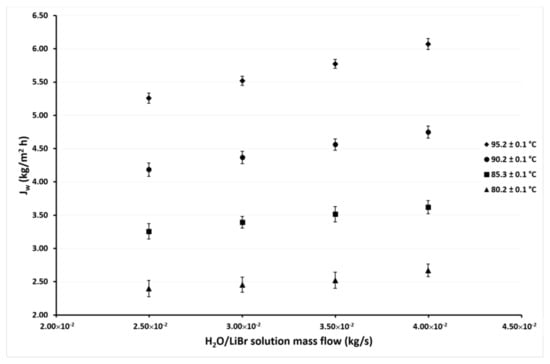 Figure 6 shows the variation of Jw as a function of LiBr with the same solution temperatures as in Figure 5 but with the cooling water temperature of 40.1 °C. As can be seen, the desorption rate behavior is similar as shown in Figure 5, but in this case, the Jw values are higher, since in this case, the minimum value was 1.7 kg/m2h, and the maximum value was 5.2 kg/m2h. These values represent an increment of 52% and 14% of the minimum and maximum values, respectively, over those reported in Figure 5 at the cooling water temperature of 45.1 °C. The effect of the LiBr was similar to that observed in Figure 5, since the increment of Jw was 14% on average at the highest LiBr value (4.00 × 10−2 kg/s) with respect to the lowest value of 2.50 × 10−2 kg/s at constant a TLiBr,in. Meanwhile, the Jw increased 169% on average at TLiBr,in = 95.2 °C with respect to the TLiBr,in = 80.2 °C.