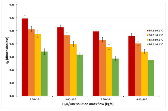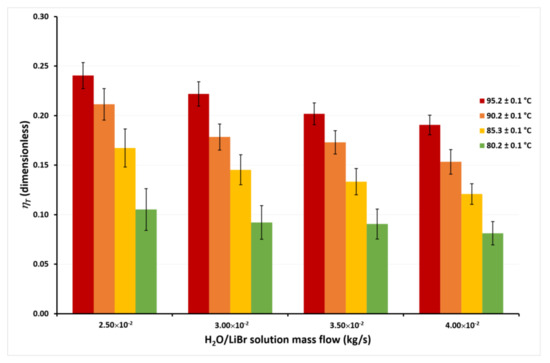 The calculated energy efficiencies (ηT) for the highest (Tcw,in = 45.1 °C) and lowest (Tcw,in = 30.1 °C) cooling water temperatures for the tested H2O/LiBr solution mass flows and the different solution temperatures are shown in Figure 9 and Figure 10. Similar behavior of the ηT was calculated with the other cooling water temperatures, but they are not presented, in an attempt to avoid repeatability.